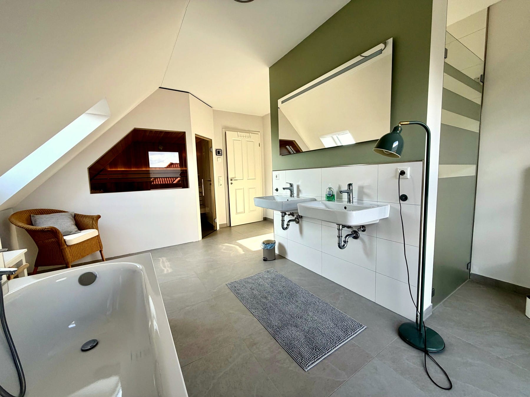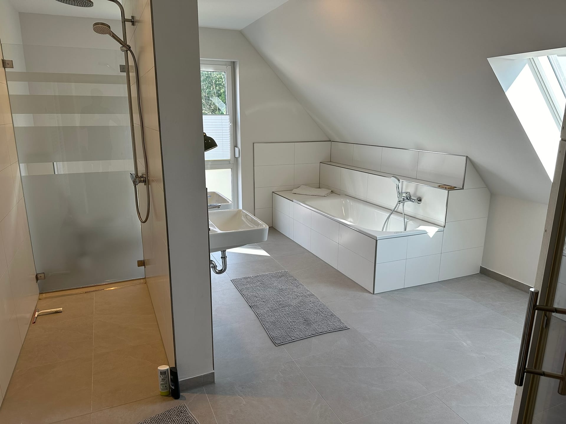 Das großzügige, moderne Badezimmer überzeugt mit stilvollem Design und hochwertiger Ausstattung für höchsten Komfort.